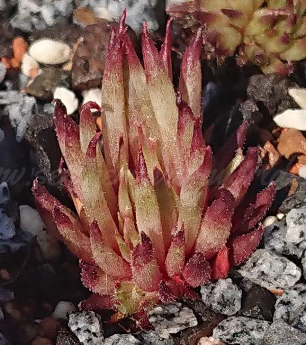 Sempervivum Matuku-Züchter-Yvonne Rudolph-Rote-Marmorierte-Röhrenblättrige Rosetten mit dunkelroten Spitzen