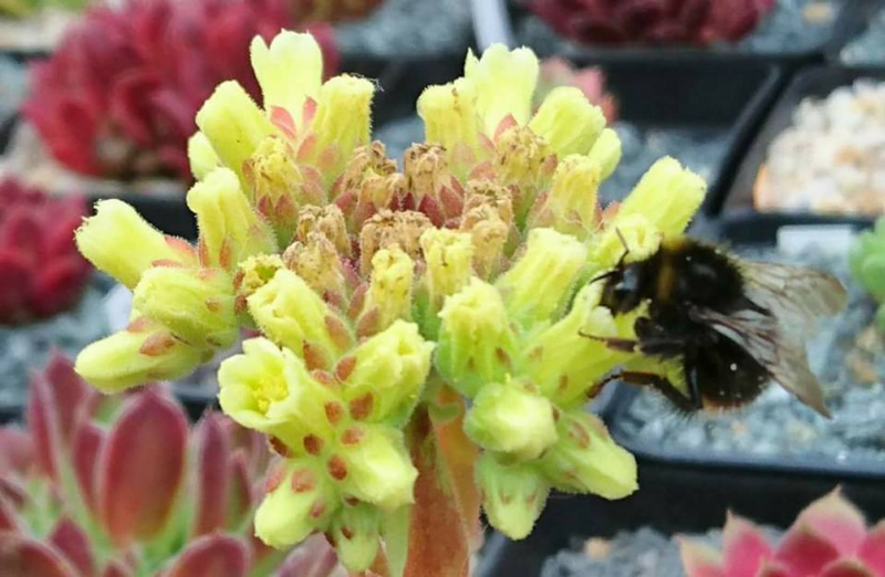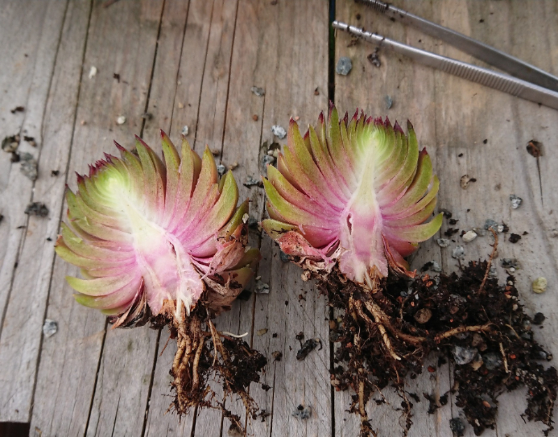 Einer meiner ersten Tests mit einer Jovibarba heuffelii: nur halbiert. Es hat länger gedauert (die wachsen ja viel langsamer), aber es hat geklappt – ein Teil blühte (Hummeln happy), der andere erholte sich und trieb neue Rosetten.